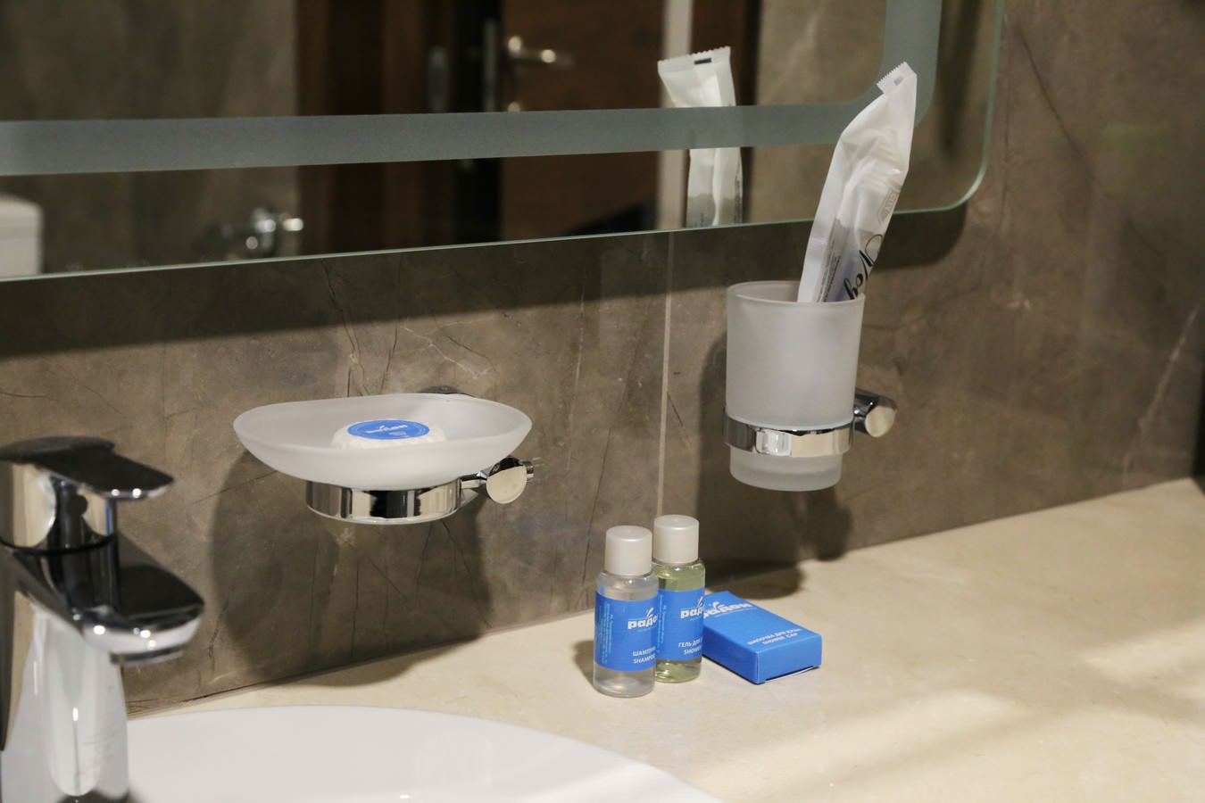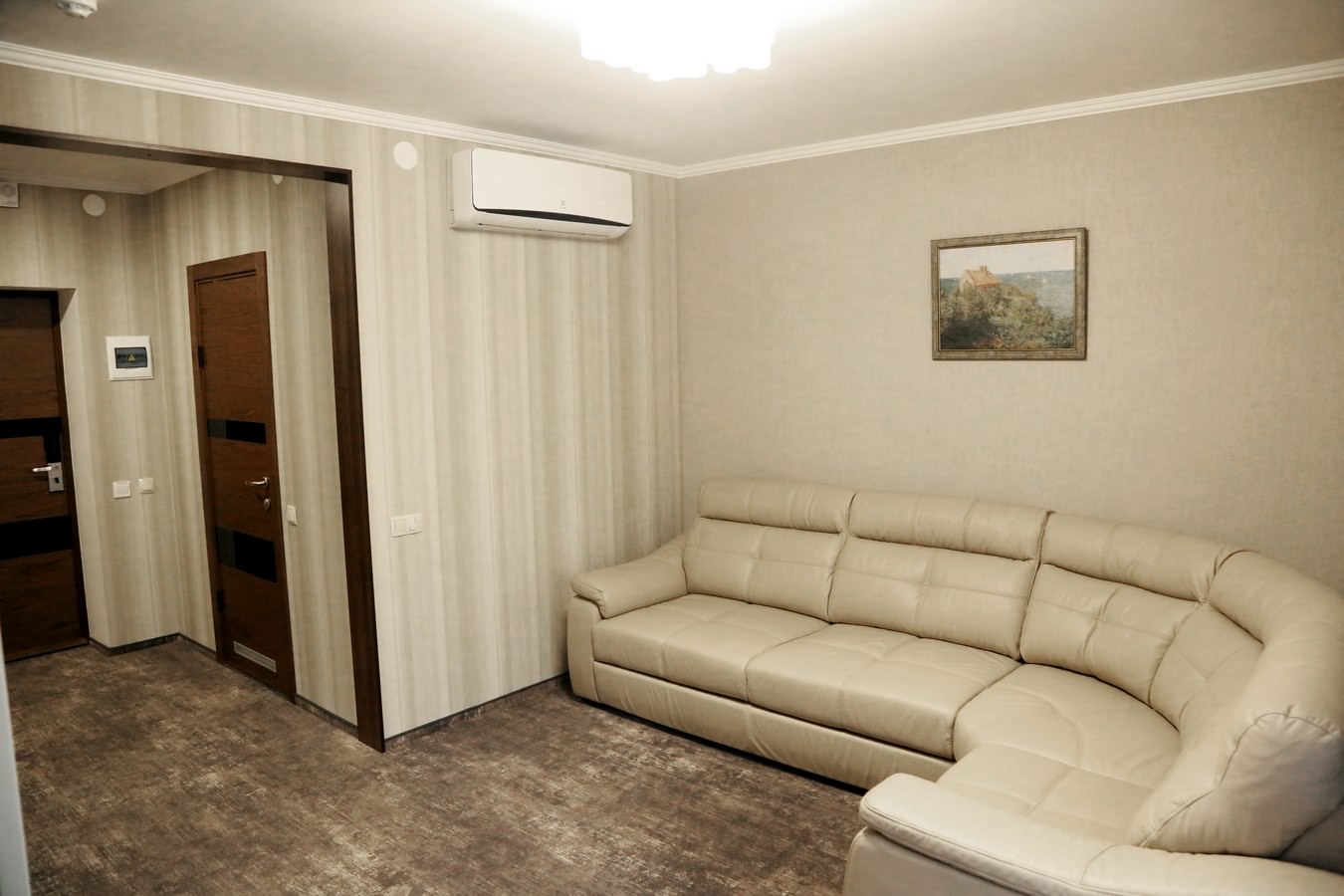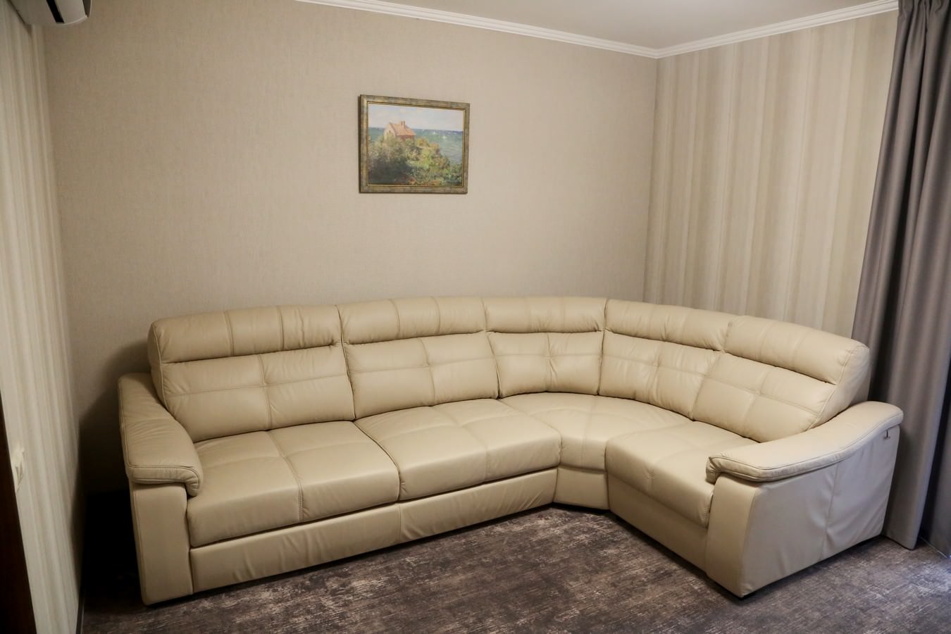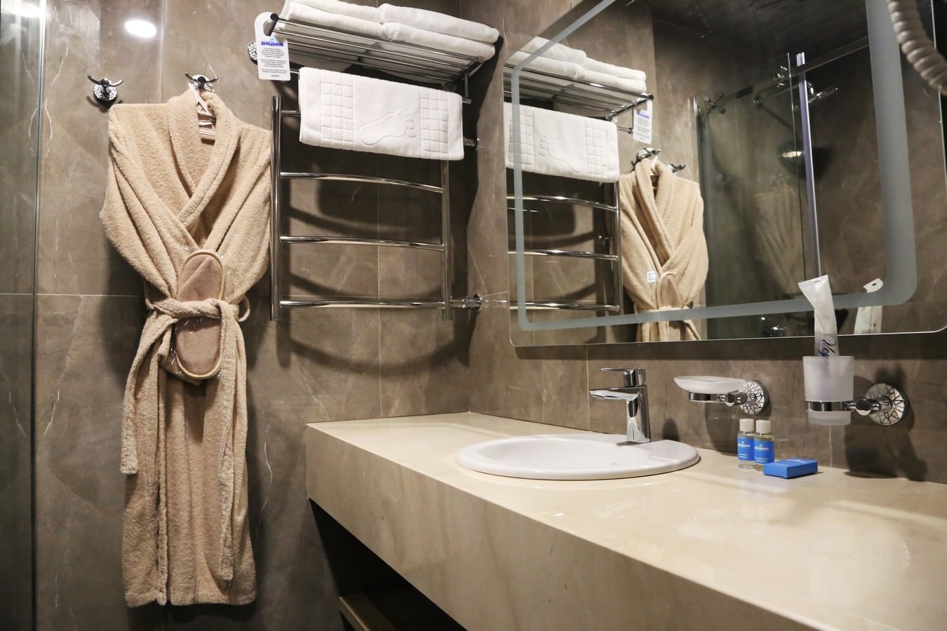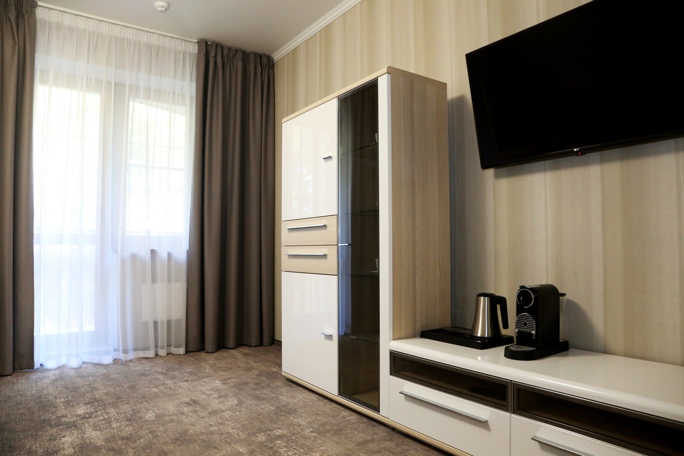 В номере: в спальне удобная двуспальная кровать размером 160*200 см., в гостиной угловой диван, 2 ванные комнаты с феном и набором гигиенических и косметических средств, халат, балкон, ТВ, бесплатный Wi-Fi, кондиционер, телефон, холодильник, чайник, набор посуды, утюг и гладильная доска, шкаф-купе в прихожей, туалетный столик, шторы с полным затемнением комнаты.