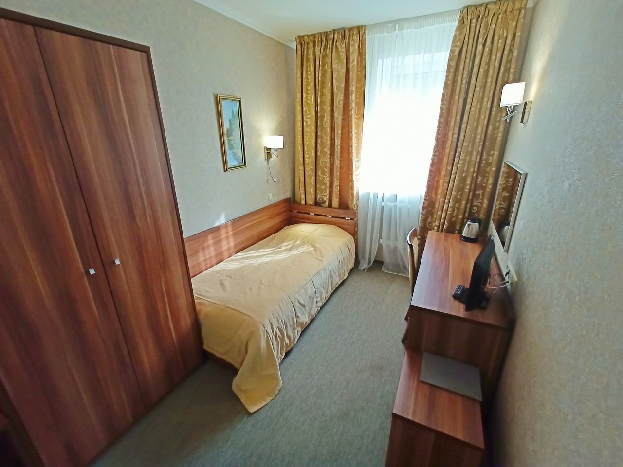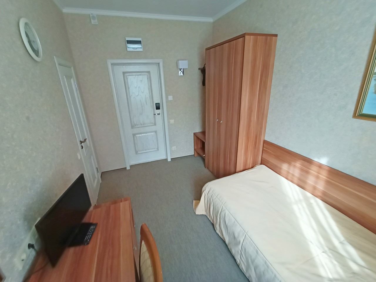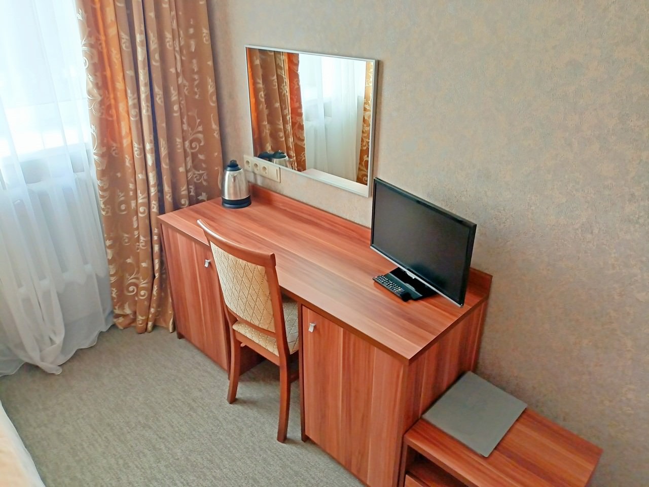 В номере: душ, умывальник, туалет, фен, ТВ, холодильник, чайник, телефон, стол, стул, шторы с полным затемнением комнаты, шкаф, тумбочка.