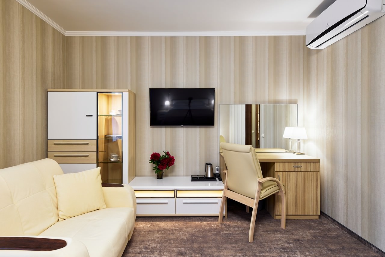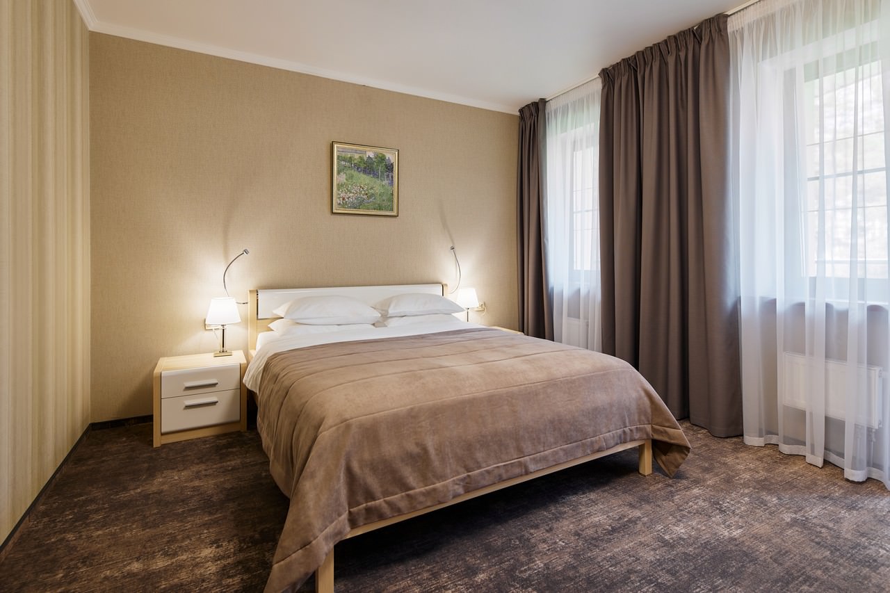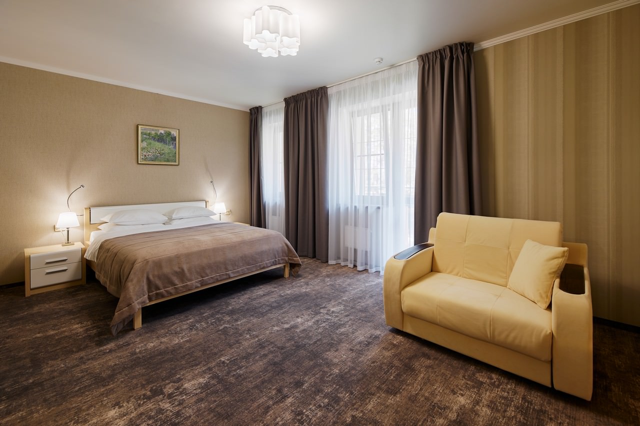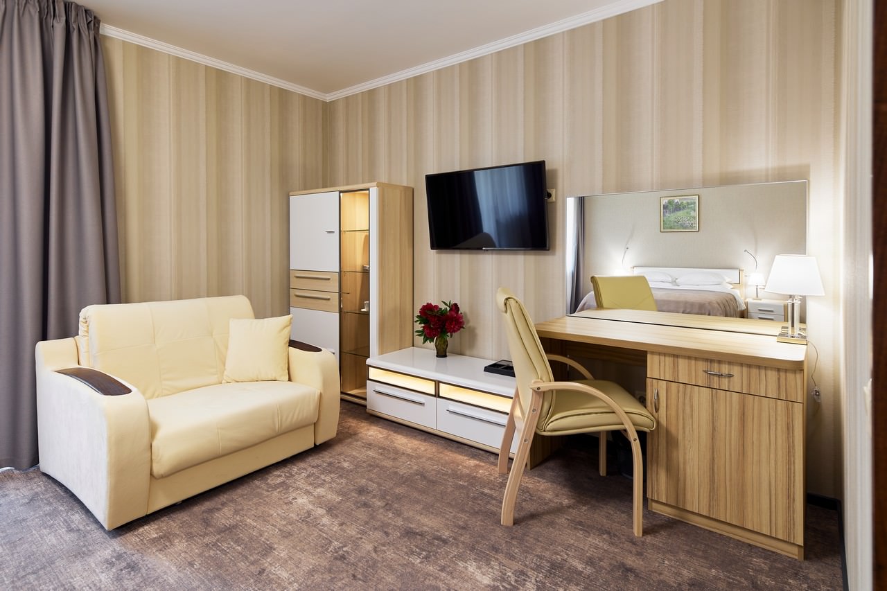 В номере: удобная двуспальная кровать размером 160*200 см., ванная комната с феном и набором гигиенических и косметических средств, халат, балкон, ТВ, бесплатный Wi-Fi, кондиционер, телефон, холодильник, чайник, набор посуды, утюг и гладильная доска, шкаф-купе в прихожей, туалетный столик, шторы с полным затемнением комнаты.